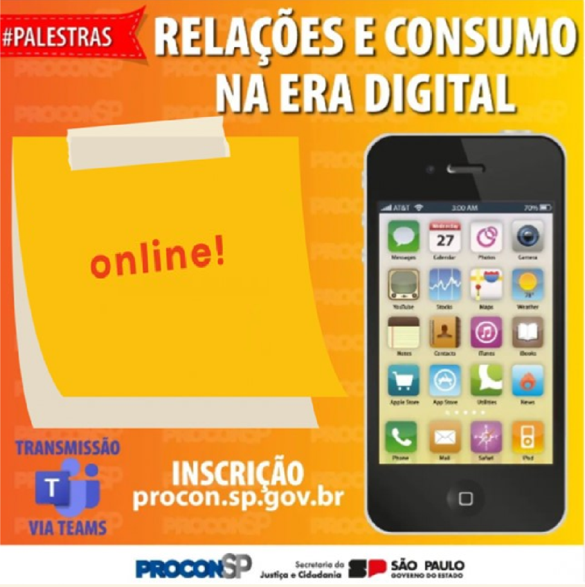 São Paulo, junho de 2025 – Procon-SP promove no dia 26 de junho uma palestra virtual gratuita sobre Relações de Consumo na Era Digital, tema que ganha cada vez mais relevância diante do avanço da tecnologia e da transformação das relações de consumo no ambiente virtual. As inscrições podem ser feitas até a véspera do palestra, pela seção ‘Palestras’ no site www.procon.sp.gov.br.