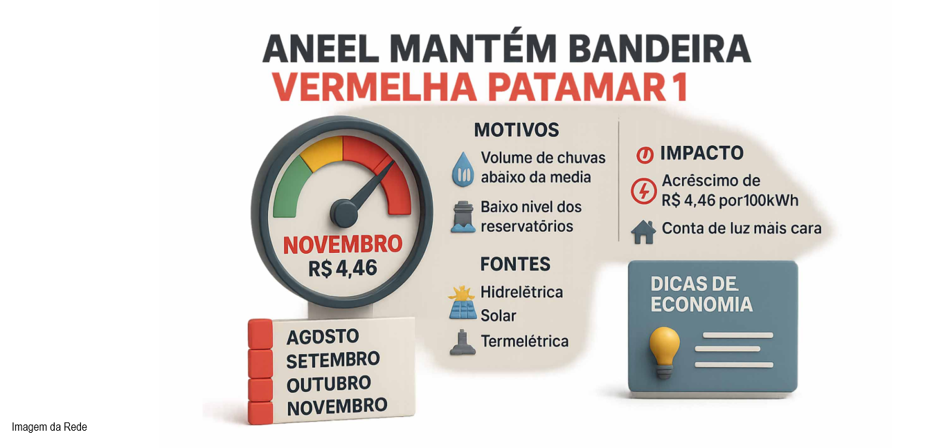 Agência Nacional de Energia Elétrica (ANEEL) informa, na sexta-feira (31/10), que a bandeira tarifária para o mês de novembro será vermelha patamar 1. Com essa sinalização, fica mantido o custo adicional de R$ 4,46 a cada 100 kWh consumidos, como ocorreu em outubro.