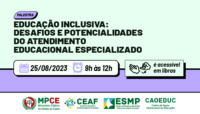 Com o objetivo de debater o direito à Educação, tendo como foco a oferta do Atendimento Educacional Especializado (AEE), o Ministério Público do Estado do Ceará (MPCE) promove, nesta sexta-feira (25/08), das 9h às 12h, um ciclo de palestras com o tema “Educação Inclusiva: Desafios e potencialidades do Atendimento Educacional Especializado”. O evento, que será transmitido pelo canal do MPCE no Youtube, é aberto ao público, contando ainda com acessibilidade em libras. Os interessados em acompanhar o ciclo de palestras, que dará direito a certificado de três horas/aula, deverão se inscrever através da Plataforma de Cursos da ESMP/CEAF.