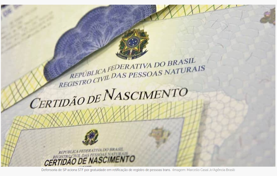 A Defensoria Pública de São Paulo acionou o STF para garantir a gratuidade na retificação do nome e gênero de pessoas trans. Para o órgão, a cobrança de taxas para a realização da mudança implica em "descumprimento" da decisão da Corte que garantiu à população trans o direito de alterar o registro civil diretamente em cartórios. Os custos giram em torno de R$ 500.