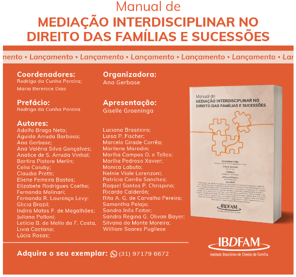 Do desejo da Comissão Nacional de Mediação do Instituto Brasileiro de Direito de Família – IBDFAM de difundir as ideias da mediação familiar na atualidade, nasceu o “Manual de Mediação Interdisciplinar no Direito das Famílias e Sucessões”, nova publicação da Editora IBDFAM. Clique aqui e garanta o seu exemplar!