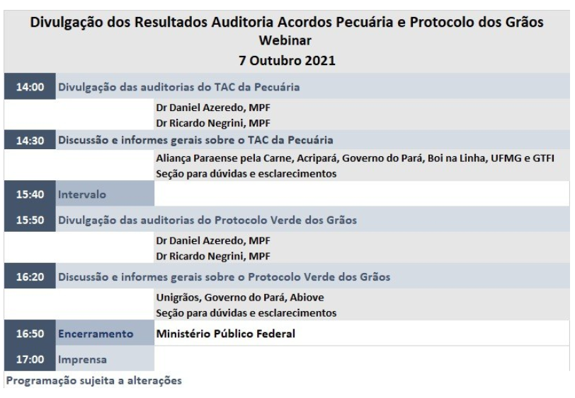 O Ministério Público Federal (MPF) confirmou para esta quinta-feira (7) a realização do evento de divulgação dos resultados de novas auditorias da sustentabilidade das cadeias econômicas da pecuária e dos grãos no Pará.