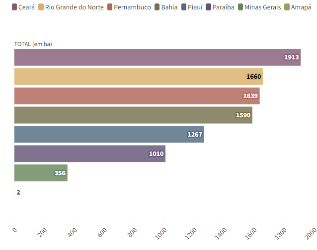Entre os biomas que mais sofreram com projetos de renováveis, a Caatinga desponta na frente, com 92,6 % do total desmatado no período. Em seguida aparecem o Cerrado, com 7,3%, e a Amazônia, com 0,1% do total desmatado.