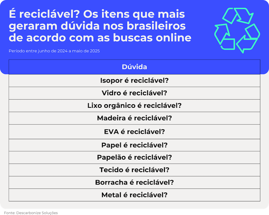 Para descobrir os itens que mais geram dúvidas entre os brasileiros sobre sua possibilidade de reciclagem, a Descarbonize Soluções partiu da análise da pergunta “é reciclável?”. Foram levantadas as buscas de plataformas da internet como Google, Bing, Youtube, TikTok, X e Pinterest. Analisaram-se então os dados disponíveis do último ano, correspondendo ao período dos últimos doze meses. Para a criação do ranking, foram selecionados os dez primeiros resultados que apresentaram maior volume de buscas.