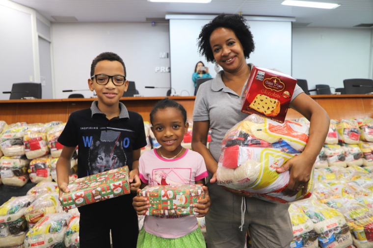O Núcleo de Qualidade de Vida no Trabalho – Vida Plena realizou na manhã desta segunda-feira (18), no auditório da Procuradoria Geral de Justiça, a entrega de 191 cestas básicas e panetones que foram adquiridos com a campanha “Faça uma Terceira Pessoa Feliz neste Natal”. Foram entregues ainda 99 presentes aos filhos e filhas dos colaboradores terceirizados que trabalham na sede da Procuradoria Geral de Justiça e promotorias de Cuiabá e Várzea Grande.