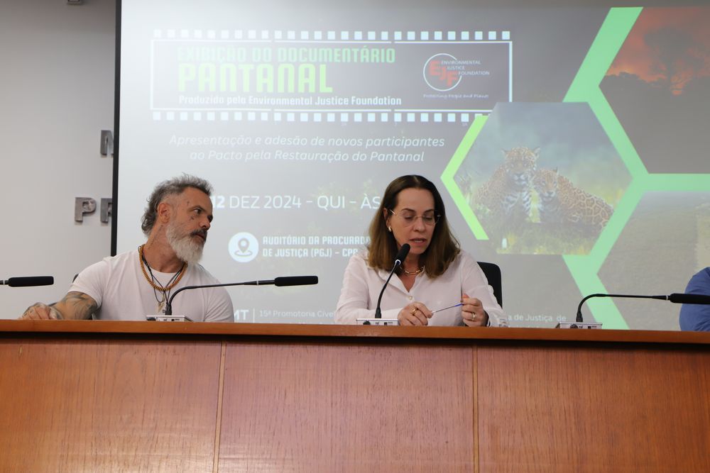 Luciana Leite, representante da EJF no Brasil e uma das ambientalistas que participam do documentário, agradeceu a presença dos espectadores que encheram o auditório da PGJ. “Assim como o documentário mostra, o Pantanal espera um pouco de sacrifício de cada um de nós, porque de fato a realidade que hoje a gente vivencia no bioma não é fácil e o filme mostra bem isso. Mas o filme também termina com essa mensagem de esperança e esse convite de que ainda dá tempo, pois ainda temos um lugar que é precioso e único no planeta, a joia da coroa da biodiversidade”, defendeu.