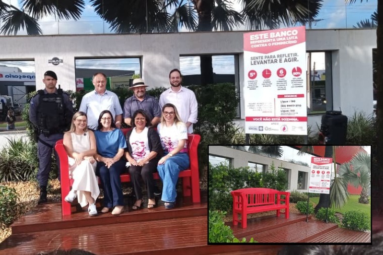 A Lei 14.942/2024 prevê a instalação de bancos vermelhos, em espaços públicos, com mensagens de reflexão sobre a violência contra a mulher e contatos para denúncia e suporte a vítimas. Em Sapezal, o banco traz estatísticas sobre essa prática e telefones para estimular a denúncia.
