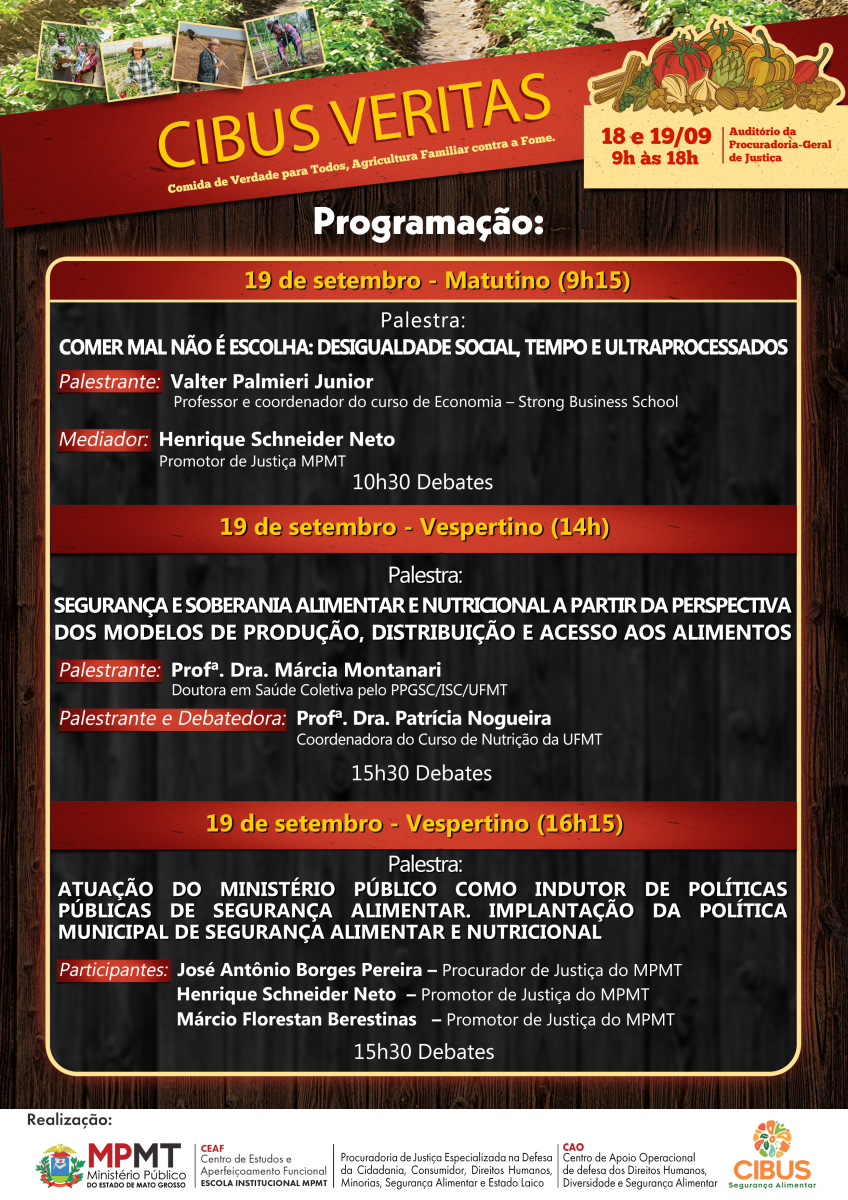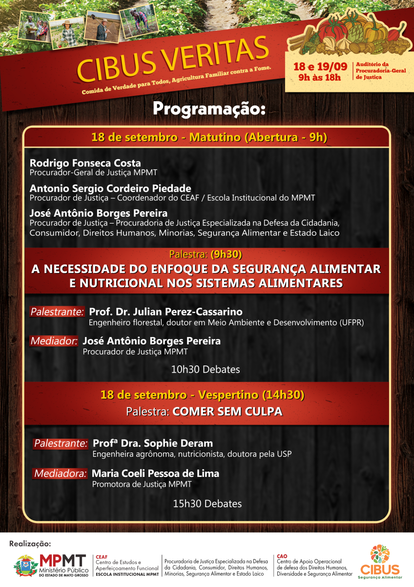 O Ministério Público do Estado de Mato Grosso (MPMT) realiza, nos dias 18 e 19 de setembro, o evento Cibus Veritas: Comida de Verdade para Todos, Agricultura Familiar contra a Fome, no auditório da Procuradoria-Geral de Justiça, em Cuiabá. O encontro tem como objetivo fomentar o debate sobre políticas públicas de segurança alimentar e nutricional, com foco na agricultura familiar como estratégia de enfrentamento à fome.