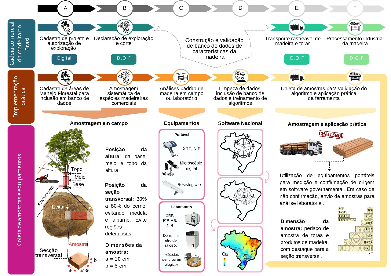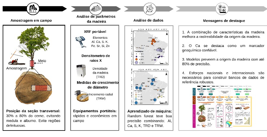 A pesquisa propõe uma abordagem inovadora e de baixo custo para rastrear a origem geográfica da madeira, utilizando características físicas e químicas do lenho, como densidade, taxas de crescimento e elementos químicos como cálcio, potássio, enxofre e alumínio, servindo como “impressões digitais” da madeira.