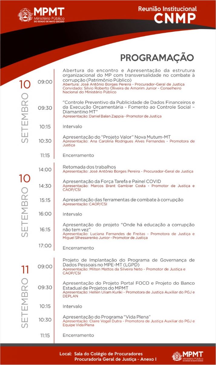 A reunião institucional será aberta na quinta-feira (10), às 9h, pelo procurador-geral de Justiça, que fará uma apresentação da estrutura organizacional do MPMT com transversalidade no enfrentamento à corrupção (Patrimônio Público). Na sequência, os promotores de Justiça Daniel Balan Zappia (Diamantino) e Ana Carolina Rodrigues Alves Fernandes (Nova Mutum) falarão, respectivamente sobre "Controle Preventivo da Publicidade de Dados Financeiros e da Execução Orçamentária - Fomento ao Controle Social” e “Projeto Valor”.