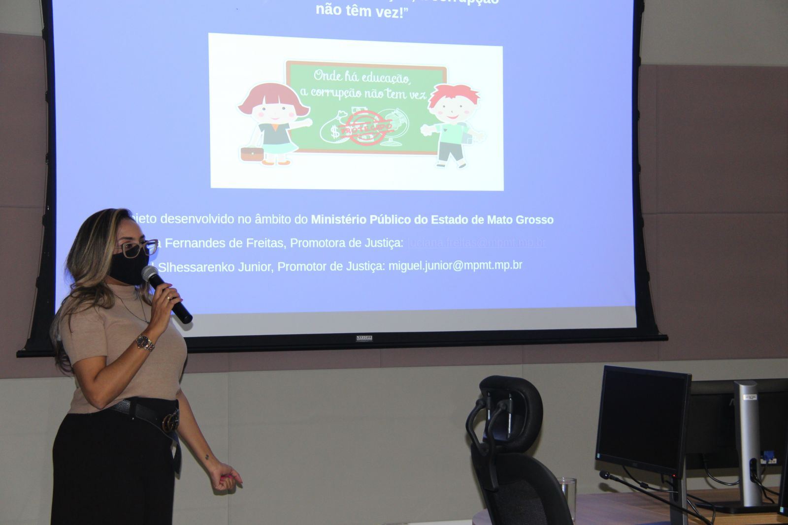 EDUCAÇÃO: Em seguida, os promotores de Justiça Luciana Fernandes de Freitas (Jaciara) e Miguel Slhessarenko Junior (Cuiabá) falaram sobre o projeto “Onde há educação a corrupção não tem vez”, criado em Porto Alegre do Norte (a 1.125km da Capital) no ano de 2015 e replicado em diversos municípios do Estado. A iniciativa, que faz parte do Banco Nacional de Projetos do CNMP, consiste em trabalhar a prevenção primária à corrupção nas escolas, por meio de uma metodologia dinâmica criativa-indutiva de formação de valores de cidadania entre os estudantes do ensino fundamental. A ideia é provocar reflexão e mudança de cultura com técnicas de artes, redação e oratória.