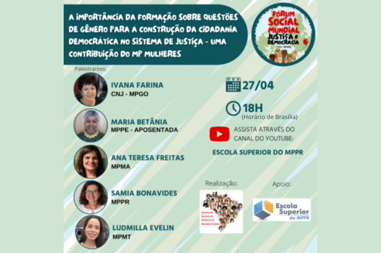 A live integra o processo de mobilização do Fórum Social Mundial Justiça e Democracia (FSMJD), e contará também com a apresentação do Movimento Nacional de Mulheres do Ministério Público. Além da promotora mato-grossense, serão debatedoras no evento a procuradora de Justiça do Ministério Público do Estado de Goiás (MPGO) e conselheira do Conselho Nacional de Justiça (CNJ), Ivana Farina Navarrete Pena, a promotora de Justiça do Ministério Público do Estado do Maranhão (MPMA) Ana Teresa Silva de Freitas, a subprocuradora-geral para Assuntos de Planejamento Institucional do Ministério Público do Estado do Paraná, Samia Saad Gallotti Bonavides, e a procuradora de Justiça aposentada do Ministério Público de Pernambuco (MPPE) Maria Betânia Silva.