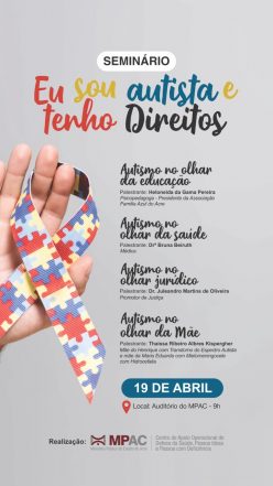O Ministério Público do Estado do Acre (MPAC), por intermédio do Centro de Apoio Operacional de Defesa da Saúde, Pessoa Idosa e Pessoa com Deficiência, realiza, amanhã (19), seminário sobre o autismo e os direitos das pessoas que vivem nessa condição.