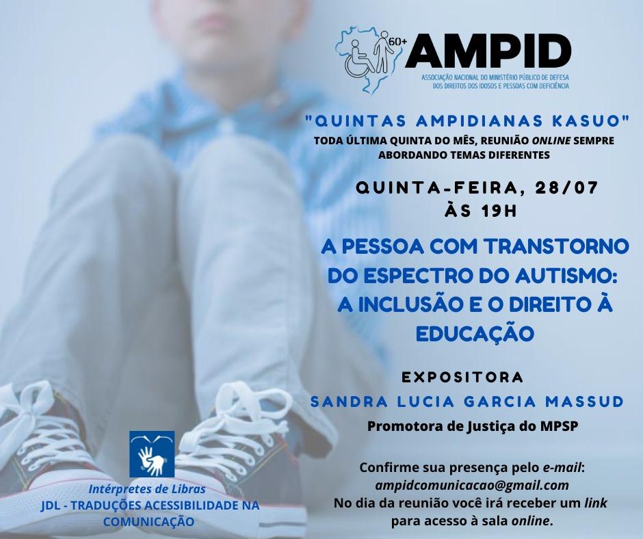 Na próxima quinta-feira, dia 28/07, às 19h, acontece mais um encontro virtual das Quintas Ampidianas Kasuo, desta vez com o tema "A pessoa com Transtorno do Espectro do Autismo: a inclusão e o direito à educação” que será apresentado por Sandra Garcia Massud, Promotora de Justiça do MPSP.