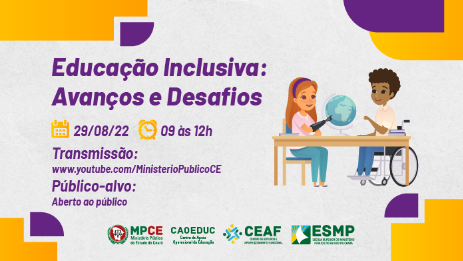 O Ministério Público do Estado do Ceará (MPCE), por meio do Centro de Apoio Operacional da Educação (Caoeduc) e do Centro de Estudos e Aperfeiçoamento Funcional (CEAF), com apoio da Escola Superior do Ministério Público (ESMP), realizará, no dia 29 de agosto de 2022, o evento on-line “Educação Inclusiva: Avanços e Desafios”. O objetivo é fomentar o debate sobre o direto à educação, difundir ações de inclusão para pessoas com deficiência e, dessa forma, fortalecer a atuação do Ministério Público e dos agentes sociais que atuam na seara educacional. A programação é aberta ao público e será transmitida pelo canal do Youtube do MPCE. Os interessados podem se inscrever por meio da Plataforma de cursos da ESMP/CEAF.