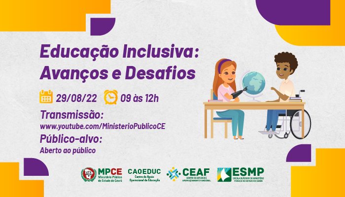 O Ministério Público do Estado do Ceará (MPCE), por meio do Centro de Apoio Operacional da Educação (Caoeduc) e do Centro de Estudos e Aperfeiçoamento Funcional (CEAF), com apoio da Escola Superior do Ministério Público (ESMP), realizará, no dia 29 de agosto de 2022, o evento on-line “Educação Inclusiva: Avanços e Desafios”. O objetivo é fomentar o debate sobre o direto à educação, difundir ações de inclusão para pessoas com deficiência e, dessa forma, fortalecer a atuação do Ministério Público e dos agentes sociais que atuam na seara educacional. A programação é aberta ao público e será transmitida pelo canal do Youtube do MPCE. Os interessados podem se inscrever por meio da Plataforma de cursos da ESMP/CEAF.