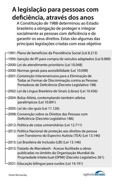 São muitas as leis que tratam especificamente de acessibilidade e inclusão no Brasil. A primeira e mais antiga delas data de 1962, quando a Lei 4.169 oficializou as convenções Braille para uso na escrita e na leitura dos cegos. Desde então o país avançou, em termos de legislação, na defesa dos direitos das pessoas com deficiência. Após a promulgação da Constituição Federal de 1988, por exemplo, já são mais de duas dezenas de textos – entre leis e decretos – que versam sobre o tema.