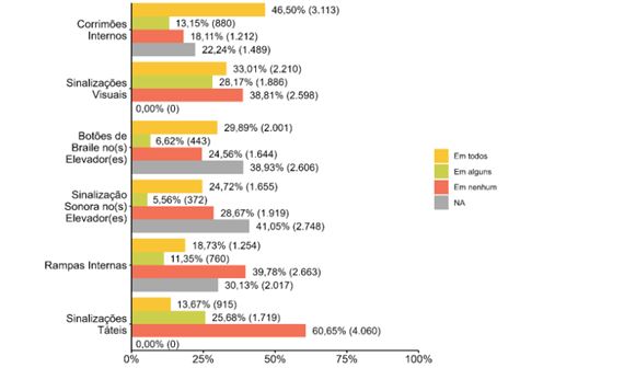 Como, por exemplo, o avanço na adaptação de rampas, banheiros e corrimãos, e a persistência nos problemas de sinalização tátil e sonora, especialmente em prédios antigos. Nesse sentido, cerca de 70% dos participantes (4,7 mil respondentes) consideraram que as rampas atendem aos requisitos de acessibilidade, enquanto 16% (pouco mais de mil participantes) apontaram inadequações nos banheiros adaptados.
