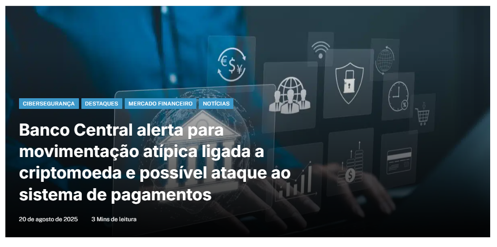O Banco Central emitiu, no domingo, 17 de agosto de 2025, um alerta à Febraban sobre uma movimentação atípica no mercado, ligada à busca por operadores da criptomoeda Tether, que poderia indicar um possível ataque a participantes do sistema de pagamentos brasileiro. A Febraban repassou o aviso aos bancos para reforçarem suas medidas de prevenção a fraudes e cibersegurança.