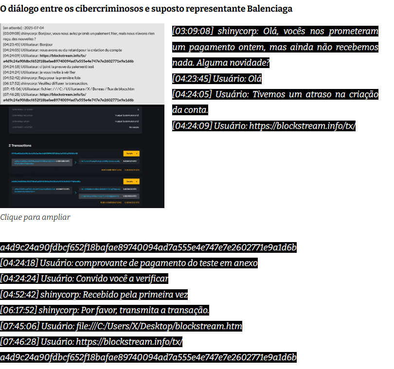 Uma controvérsia surgiu em torno de supostas negociações para resgate. O DataBreaches.net noticiou que a ShinyHunters contatou a Balenciaga no início de junho, alegando um acordo para o pagamento de US$ 750.000 em Bitcoin (imagem), com uma transação inicial que teria sido posteriormente revertida. No entanto, a Kering negou publicamente a ocorrência de quaisquer negociações ou pagamento de resgate, afirmando ter seguido as orientações das autoridades policiais.