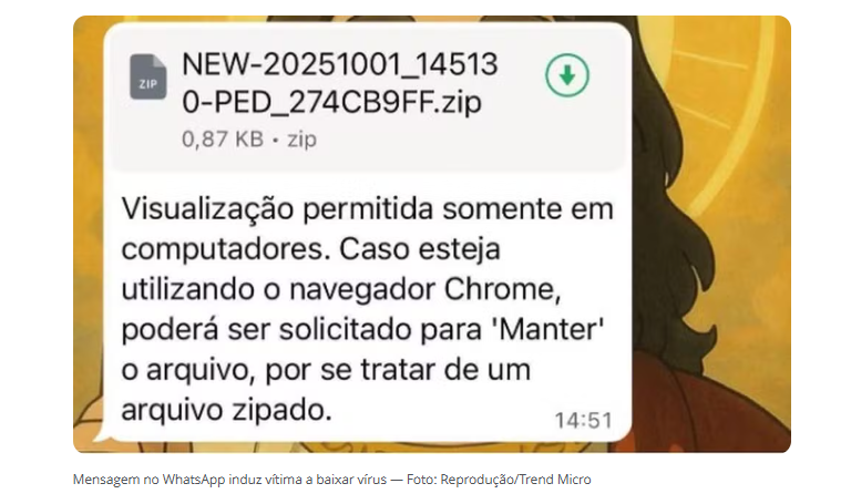 Os criminosos usam o WhatsApp para disparar supostos comprovantes de pagamento ou orçamentos de empresas, por exemplo. "Baixa o [arquivo] ZIP no PC e abre", diz uma das mensagens.