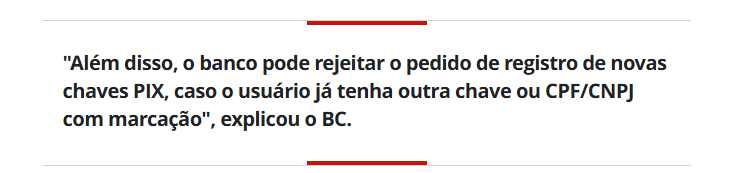 No início deste mês, por exemplo, o BC também passou a bloquear as chaves PIX indicadas pelas instituições financeiras como utilizadas para golpes e fraudes. Nesse caso, os bancos marcam o CPF/CNPJ e a chave PIX do usuário sempre que há uma suspeita de fraude.