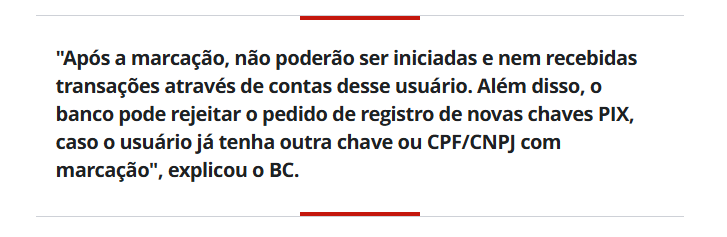A autoridade monetária explicou que as instituições financeiras marcam o CPF/CNPJ, e a chave PIX, do usuário sempre que houver uma fundada suspeita de fraude envolvendo esse usuário (leia mais abaixo).