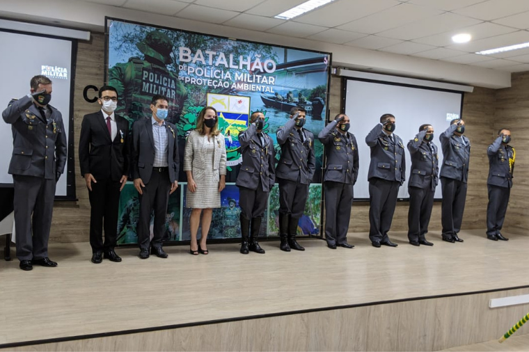 Em reconhecimento ao trabalho desenvolvido pelo Ministério Público de Mato Grosso na defesa do meio ambiente e na repressão aos crimes ambientais, os promotores de Justiça Ana Luíza Ávila Peterlini de Souza, Claudio Angelo Correa Gonzaga e Marcelo Caetano Vacchiano foram homenageados com a Medalha Mérito Protetor Ambiental. Instituída pelo Decreto Estadual nº 640/2020, a condecoração foi entregue pelo Comando Geral da Polícia Militar de Mato Grosso, por meio do Batalhão de Proteção Ambiental, na noite de terça-feira (20).