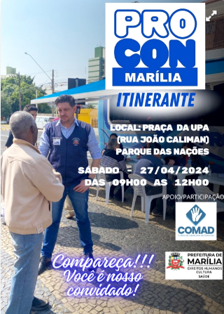 Com organização das Secretarias Municipais de Direitos Humanos, da Saúde e da Cultura, a administração municipal do prefeito Daniel Alonso, promoverá ação itinerante com o Procon Marília para facilitar o acesso aos moradores da zona Norte da cidade. O atendimento com a equipe de fiscais do órgão público de defesa do consumidor que, entre outras funções, recebe reclamações para mediar soluções com as empresas, acontecerá no próximo sábado, dia 27 de abril de 2024, das 9h às 12h, na praça da UPA (Unidade de Pronto Atendimento), rua Joaquim Caliman com a rua Ireneu Lopes, Jardim Santa Antonieta.