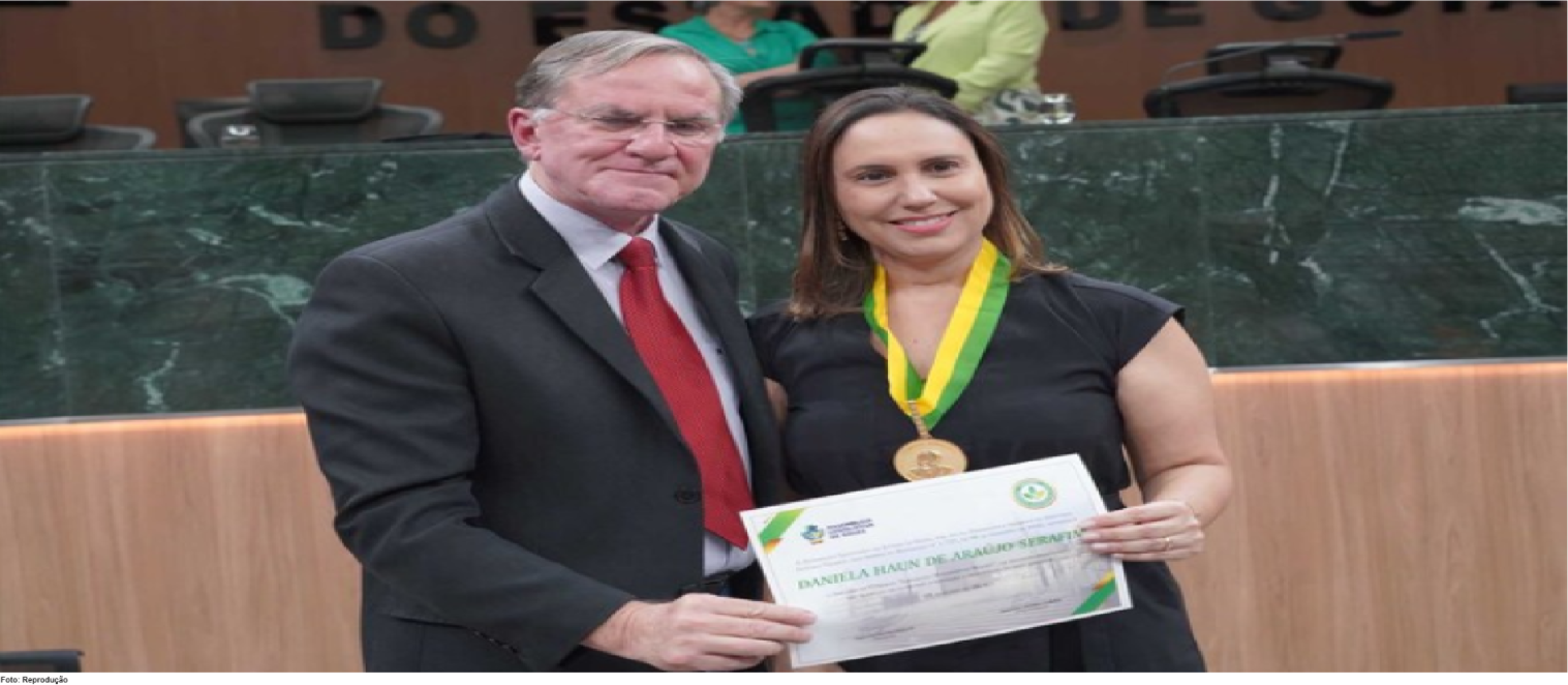 A coordenadora da Área de Meio Ambiente e Consumidor do Ministério Público de Goiás (MPGO), Daniela Haun Serafim, recebeu ontem (3/6) a Comenda Washington Novaes, concedida a personalidades e instituições que se destacaram na defesa e promoção da sustentabilidade ambiental em Goiás. Proposta pelo deputado Antônio Gomide, a honraria foi entregue em sessão solene da Assembleia Legislativa de Goiás (Alego) e antecipou as celebrações do Dia Mundial do Meio Ambiente, comemorado em 5 de junho.