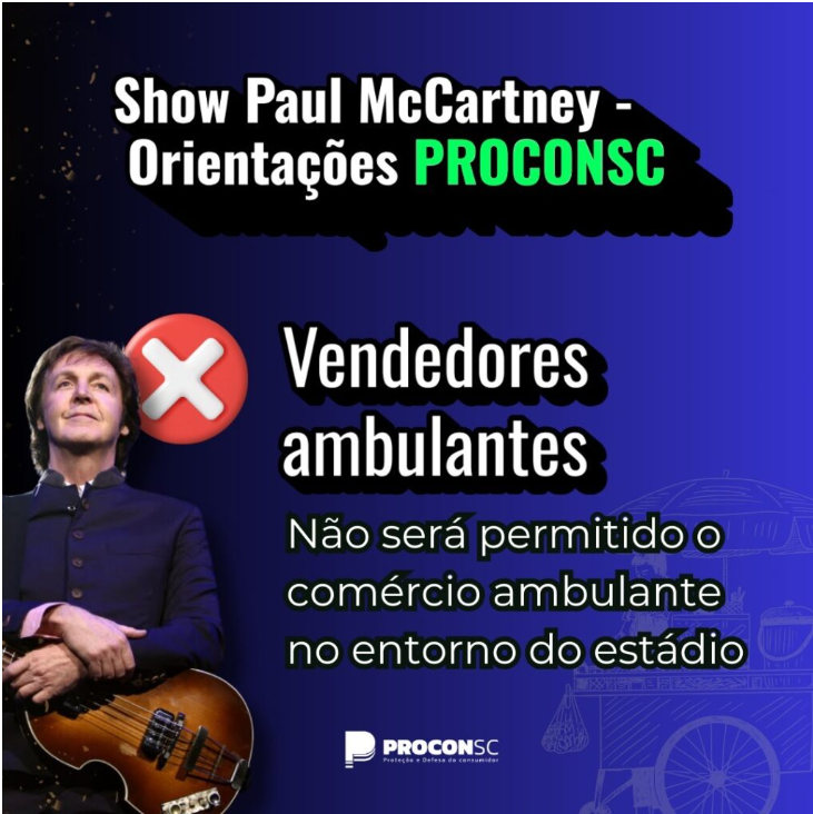 O ex-Beatle Paul McCartney fará um show histórico em Florianópolis neste sábado (19), no Estádio Aderbal Ramos da Silvada (Ressacada). O Procon SC vai atuar no evento para informar e garantir os direitos do consumidor. É importante ficar atento às orientações em relação aos estacionamentos, proibição de comércio ambulante, direito de hidratação e os itens permitidos e proibidos.