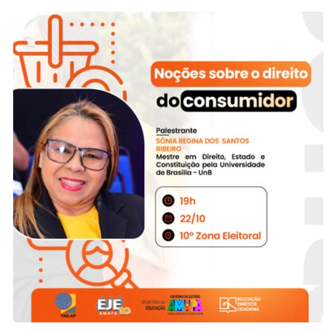 Nesta terça-feira, 22, a Escola Judiciária Eleitoral do Amapá (EJE-AP) dará continuidade às ações do Projeto Educação, Direito e Cidadania com a realização da terceira palestra do ciclo de estudos, que abordará o tema "Noções sobre o Direito do Consumidor". A palestra é voltada para turmas da Educação de Jovens e Adultos (EJA) das Escolas Maria Neuza do Carmo de Souza e Carlos Alberto Viana Marques.