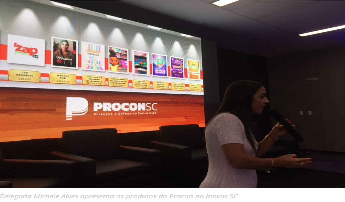 A delegada Michele Alves, diretora do Procon SC, participou na manhã desta segunda-feira (2) da 11ª edição do Inovar SC, que reuniu nomes de peso para debater inovação, negócios e empreendedorismo. O evento é realizado no auditório da Federação das Associações Empresariais de Santa Catarina (Facisc), em Florianópolis, até esta terça-feira (3).