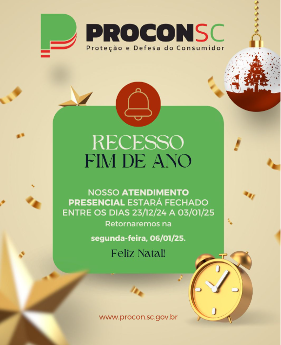 Em razão do recesso dos órgãos da administração estadual direta, publicado por Decreto do Governo, o posto de atendimento presencial do Procon SC estará fechado entre os dias 23/12/24 a 03/01/2025.