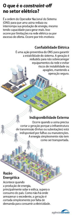 Eles debateram a restrição da produção de energia — o curtailment ou constrained off —, que é o mecanismo usado pelo Operador Nacional do Sistema (ONS) quando há limites operacionais na rede elétrica ou outras razões externas que impedem o funcionamento da usina de energia. Nesse caso, a usina poderia produzir eletricidade, mas não tem como funcionar por limitações na rede, como falta de infraestrutura para transportar a energia, ou baixa demanda, entre outros motivos. A usina eólica ou solar, mesmo que apta a funcionar, é obrigada a interromper sua produção. E por isso é ressarcida.
