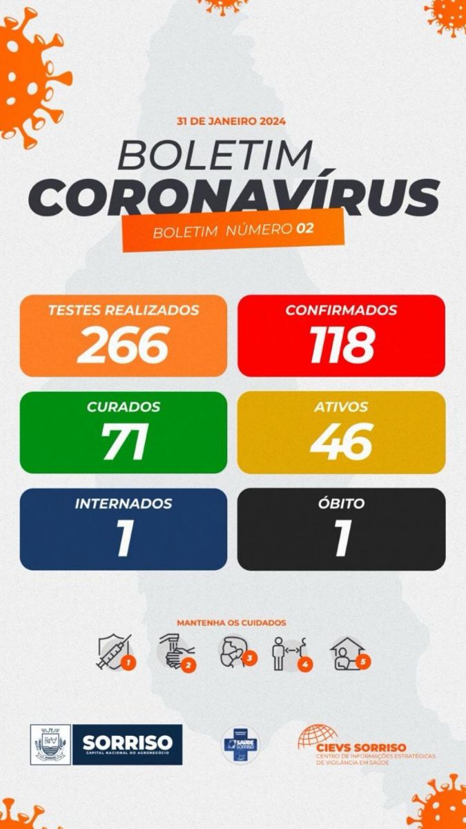 O Boletim Covid 02/2024, divulgado hoje, 31 de janeiro, aponta que desde 1.º de janeiro até esta manhã, o Município já realizou 266 testes para covid com 118 casos confirmados; 71 pessoas já estão curadas; 46 ativas. E, infelizmente, o óbito de um senhor de 72 anos foi registrado em 29 de janeiro. No boletim também é detalhada a internação de um homem de 61 anos na Unidade de Pronto Atendimento Sara Akemi Ichicava. O paciente internado tomou três doses da vacina contra a covid ainda em 2021; o registro médico aponta como comorbidade epilepsia.