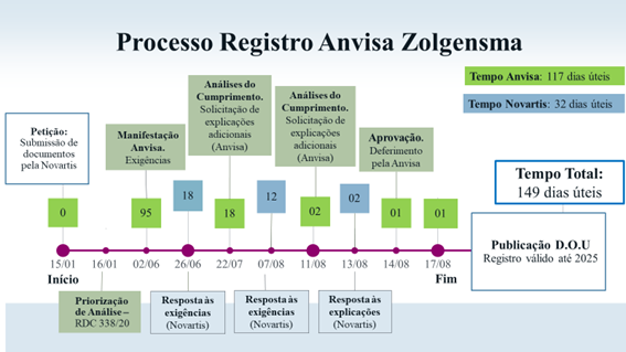 Foram 149 dias úteis de avaliação, desde a submissão dos documentos pela Novartis à Anvisa até a publicação do deferimento final no Diário Oficial da União, considerando os prazos de análise da equipe da Agência (117 dias) e das respostas ao cumprimento das exigências por parte da empresa (32 dias). Para garantir a efetiva regularização do Zolgensma no Brasil, houve inúmeras reuniões, discussões técnicas e acordos entre a Anvisa e representantes nacionais e internacionais.