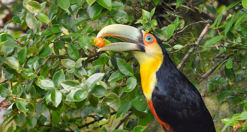 Espécies como o tucano-toco, o jacu e a gralha-do-campo ajudam a transportar sementes de frutos para áreas degradadas; quanto maior a ave, maior a semente e, portanto, maior a biomassa da árvore que cresce dela – portanto, maior potencial de sequestro de carbono.