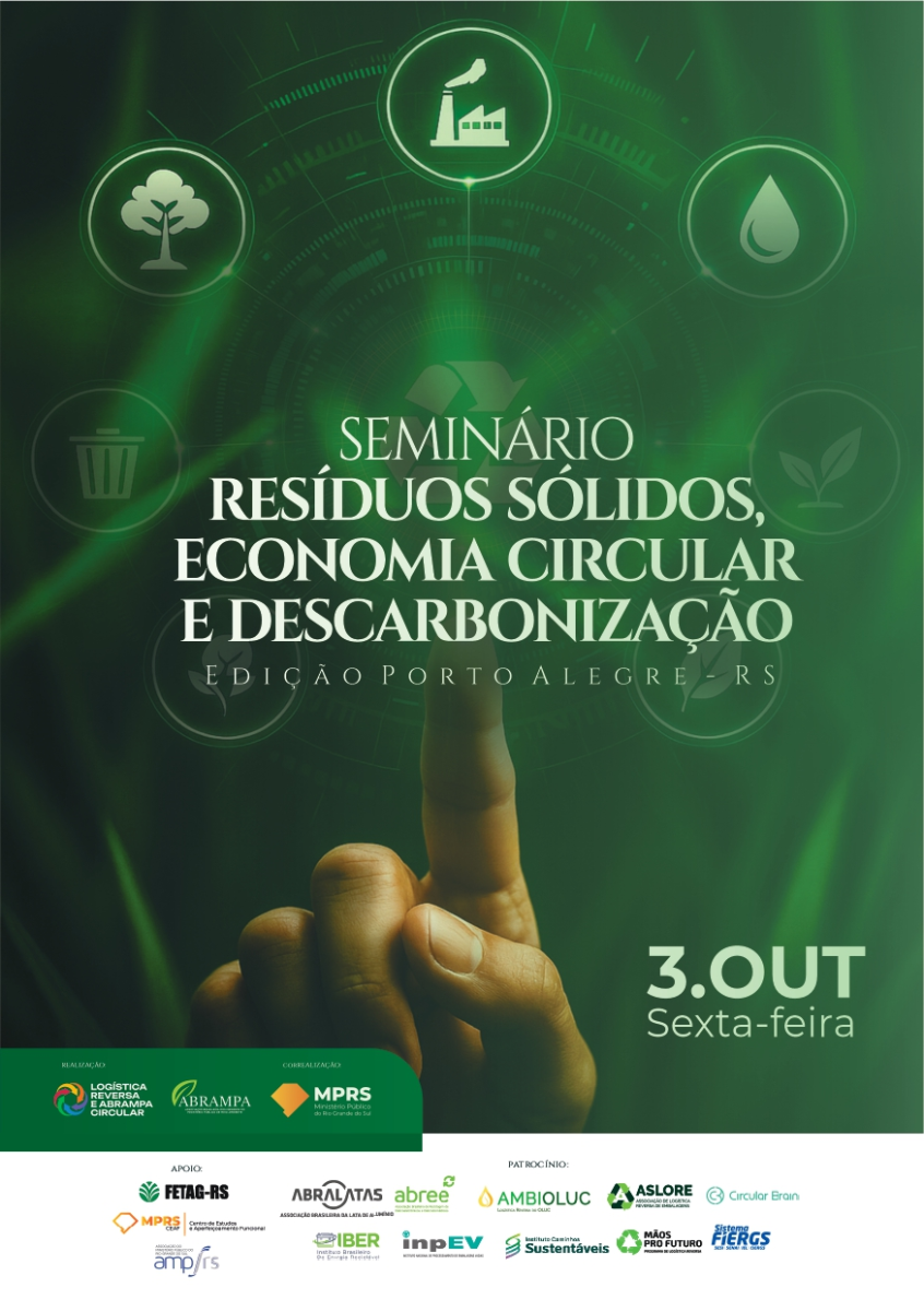 Estão abertas as inscrições para mais um seminário “Resíduos Sólidos, Economia Circular e Descarbonização”. O evento é promovido pela Associação Brasileira dos Membros do Ministério Público de Meio Ambiente (ABRAMPA) e conta com a correalização do Ministério Público do Estado do Rio Grande do Sul e com o apoio do Centro de Aperfeiçoamento Funcional (CEAF), da Associação do Ministério Público do Estado do Rio Grande do Sul (AMP-RS) e da Federação dos Trabalhadores na Agricultura no Rio Grande do Sul (FETAG-RS).
