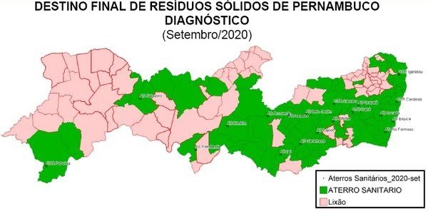 De janeiro a setembro de 2020, 71 das 184 cidades pernambucanas usaram lixões para descartar resíduos sólidos urbanos, o que equivale a 38,6%, segundo um levantamento do Tribunal de Contas do Estado de Pernambuco (TCE-PE). O número de municípios nessas condições é 22,8% menor do que em 2019, quando houve o registro de 92 cidades fazendo o descarte irregular de resíduos.