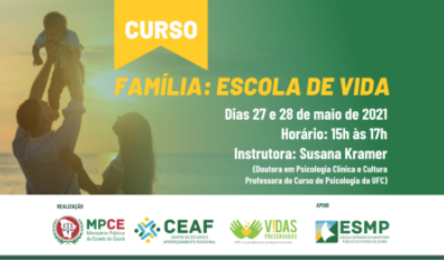 O Ministério Público do Estado do Ceará (MPCE) realiza, nos dias 27 e 28 de maio, das 15h às 17h, o Curso “Família: Escola de Vida”. Os interessados em participar da capacitação, que é aberta ao público e será transmitida pela Plataforma Microsoft Teams, devem se inscrever previamente na Plataforma de Cursos e Eventos do Centro de Estudos e Aperfeiçoamento Funcional (CEAF) para acesso ao link de transmissão e ao certificado de 4 horas/aula.