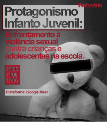 A Promotoria de Justiça da Infância e Juventude estará realizando o Webinário “Protagonismo infanto-juvenil: enfrentamento à violência sexual contra crianças e adolescentes na escola”, nos dias 27/5, 11 e 17/6/2021, destinado ao público de professores e técnicos das escolas do bairro do Tapanã, situadas na cidade de Belém do Pará. Tendo como objetivo geral fomentar práticas pedagógicas voltadas ao enfrentamento à violência sexual contra crianças e adolescentes na escola.