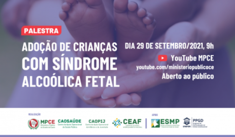 O Ministério Público do Estado do Ceará (MPCE) promove no dia 29 de setembro, às 9h, uma palestra com o tema “Adoção de crianças com síndrome alcoólica fetal”. O evento, que será transmitido pelo canal do MPCE no Youtube, é aberto ao público e visa tratar da temática trazendo uma visão jurídica e científica dos processos de adoção. A iniciativa é promovida pelos Centros de Apoio Operacional da Saúde (Caosaúde) e da Infância e da Juventude (Caopij) e pelo Centro de Estudos e Aperfeiçoamento Funcional (CEAF), com apoio da Escola Superior do Ministério Público (ESMP) e da Universidade de Fortaleza (Unifor).