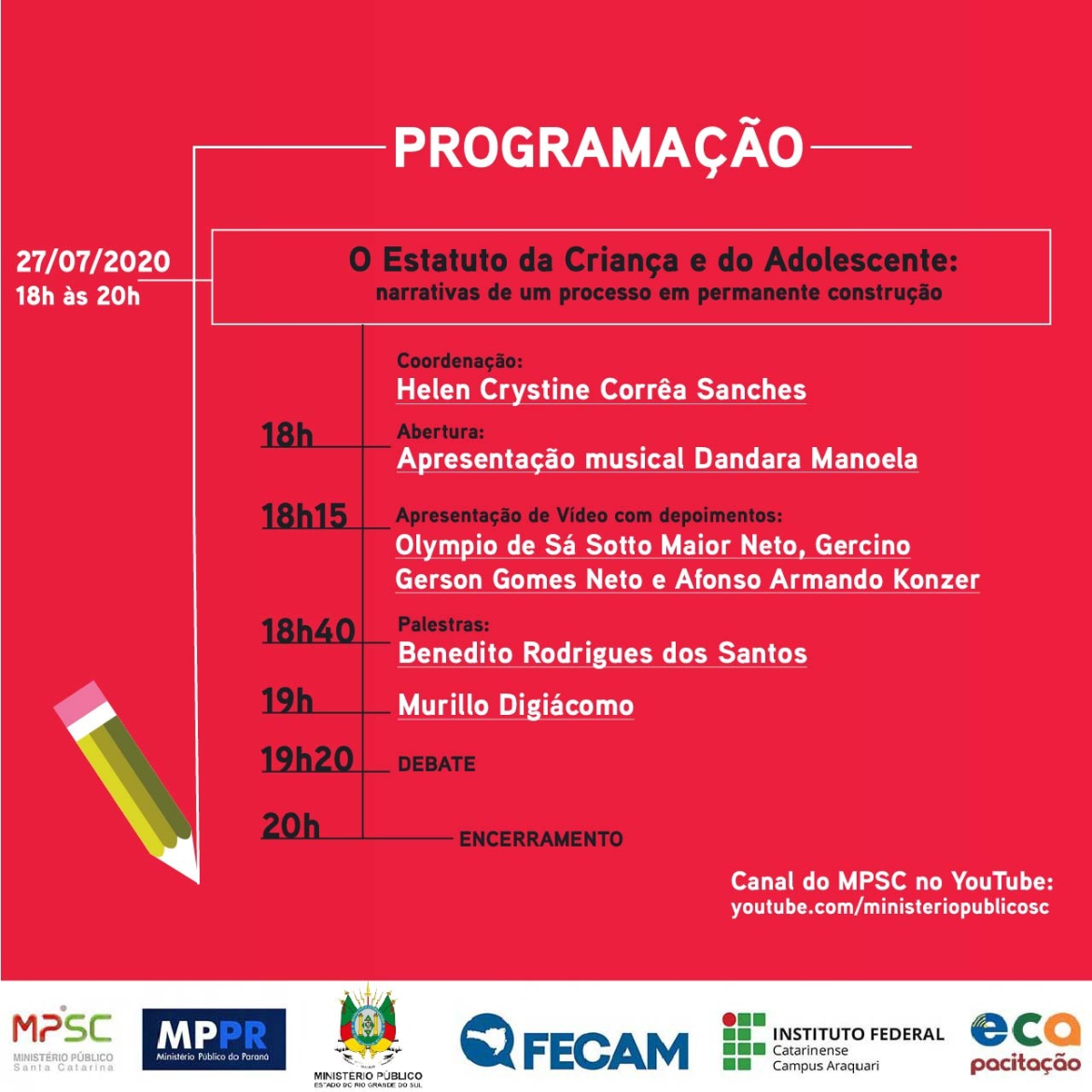 A live "O Estatuto da Criança e do Adolescente: narrativas de um processo em permanente construção" contou com uma apresentação musical de Manoela Dandara, estudante que traduz em versos a temática infantojuvenil. Os palestrantes foram Murillo Digiácomo, Procurador de Justiça do MPPR, e o pesquisador associado do International Institute for Child Rights and Development (IICRD), da Universidade de Victoria, no Canadá, e consultor do Fundo das Nações Unidas para Infância (Unicef) no Brasil e da Childhood Brasil, Benedito Rodrigues dos Santos. A mediadora foi a Promotora de Justiça Helen Crystine Corrêa Sanches, que possui larga experiência na área da infância e juventude em Santa Catarina.