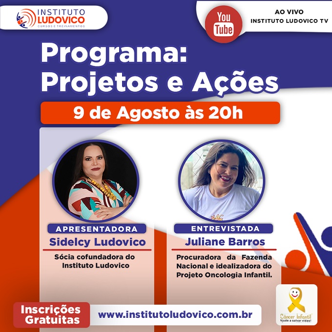 O programa Projetos e Ações será transmitido ao vivo e on-line pelo canal Instituto Ludovico TV no Youtube no dia 9/8, Domingo, às 20h.