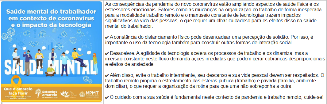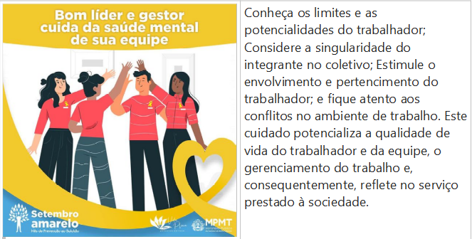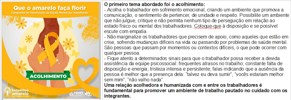 Com o foco na saúde mental do trabalhador, a campanha “Que o amarelo faça florir”, alusiva ao movimento Setembro Amarelo de prevenção ao suicídio, contou com lives no Instagram sobre a temática e divulgação de posts nas redes sociais.