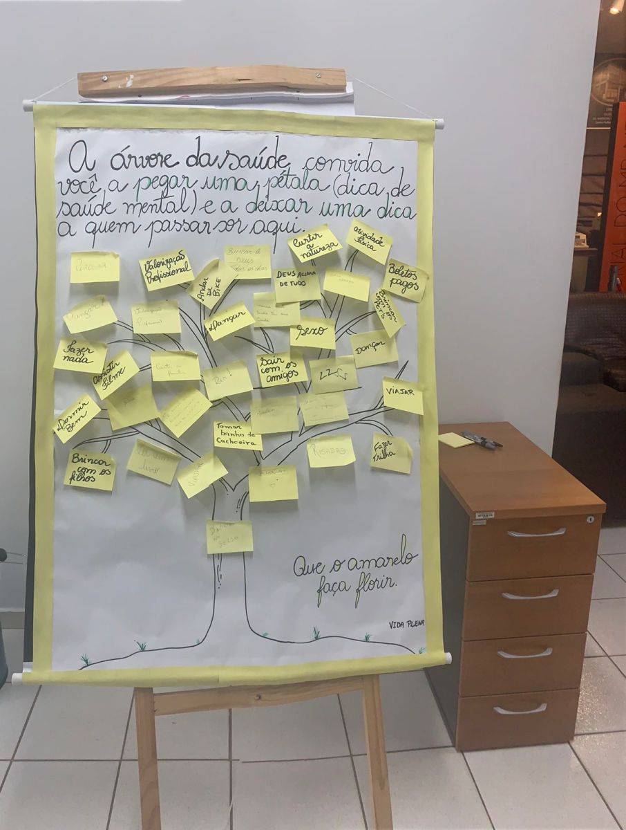Árvore da Saúde” – Como parte da campanha “Que o Amarelo Faça Florir”, a equipe do Núcleo de Qualidade de Vida no Trabalho disponibilizará um espaço no hall de entrada da Procuradoria-Geral de Justiça para que os integrantes da instituição divulguem mensagens de autocuidado com a saúde mental. A proposta é que haja troca de informações e, ao final, no dia 30, haverá roda de conversa para fechamento do diálogo.